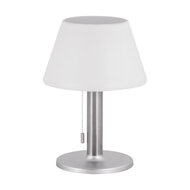 Decoratieve solar tafellamp van Pelagia voor buiten. Of het nu voor het balkon, het terras of in een gezellige tuinhoek is, deze LED tafellamp geeft daglicht wit met instelbare helderheidsniveaus tot 8 uur. Productdetails: - Klassiek ontwerp met trekketting - Zonne-energie met module - Afmetingen: Ø 20 x H 28 cm - Kunststof scherm met geïntegreerde LI-lon-batterij - 10 leds, warm wit - 3 instelbare helderheidsniveaus - Verzwaarde kunststof lampvoet voor stabiliteit - Roestvrijstalen zuil en trekketting - Voor buiten Specificaties: