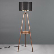 Een snuifje meer gezelligheid dankzij de COLETTE vloerlamp. Met zijn stijlvolle stoffen kap creëert de driepotige vloerlamp een gezellig lichteiland dat uitnodigt tot vertoeven. COLETTE kan gebruikt worden als leeslamp naast de bank of als zelfstandig stijlelement in de hal, woon- of slaapkamer. Als praktisch extraatje heeft de lamp een plankje voor decoraties of alledaagse voorwerpen zoals een boek. De moderne kleurencombinatie van koffiekleurige metalen poten en een stoffen kap in zwart en goud is erg populair. Voor energiezuinige verlichting wordt het gebruik van LED-lichtbronnen aanbevolen. Deze zijn een ideaal alternatief voor conventionele halogeenlichtbronnen en bieden een hoge lichtkwaliteit en energiebesparingen tot wel 80%. Met LED-lichtbronnen profiteert u bovendien van een lange levensduur en een lage warmteontwikkeling, terwijl u het milieu ontziet.